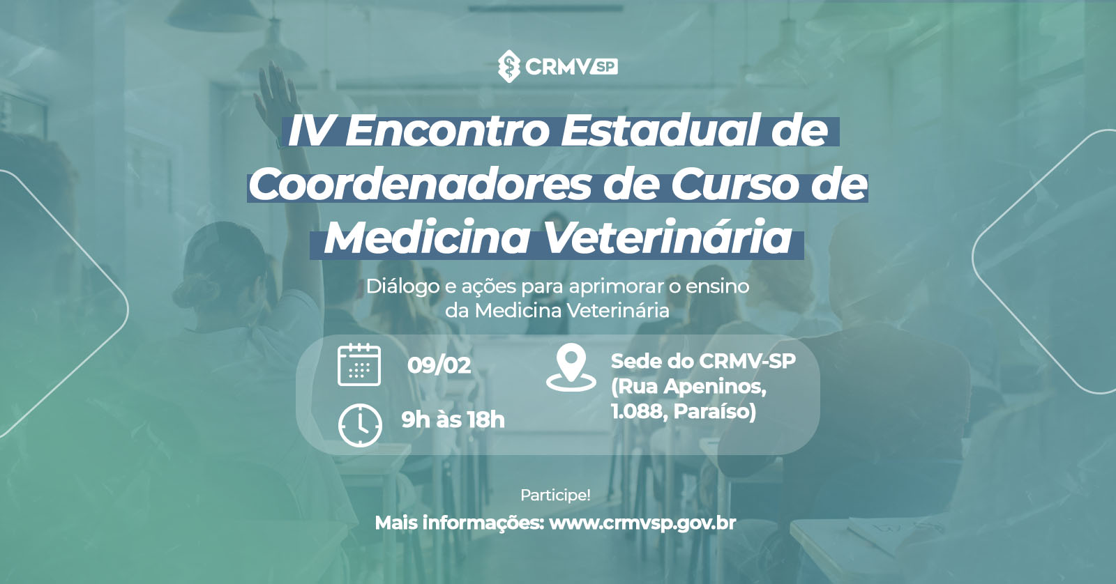 IV Encontro Estadual de Coordenadores de Curso de Medicina Veterinária do CRMV-SP O CRMV-SP, por meio da Comissão Técnica de Educação, convida ... 09 fev 09:00 - 18:00