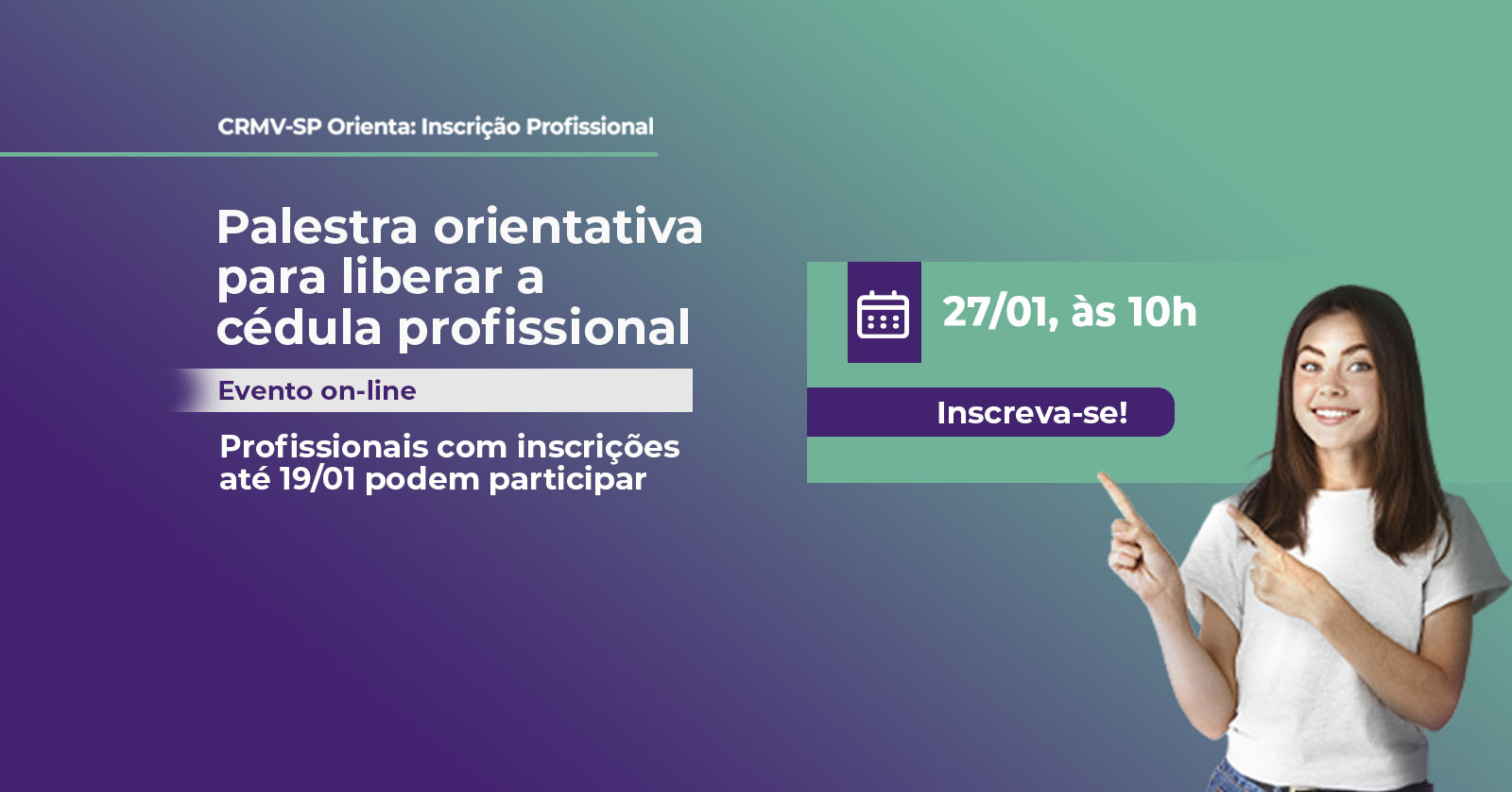CRMV-SP Orienta: Minha Primeira Inscrição 27/01 10h Profissionais com inscrição aprovada até 19/01/2026 já podem participar da ... 27 jan 10:00