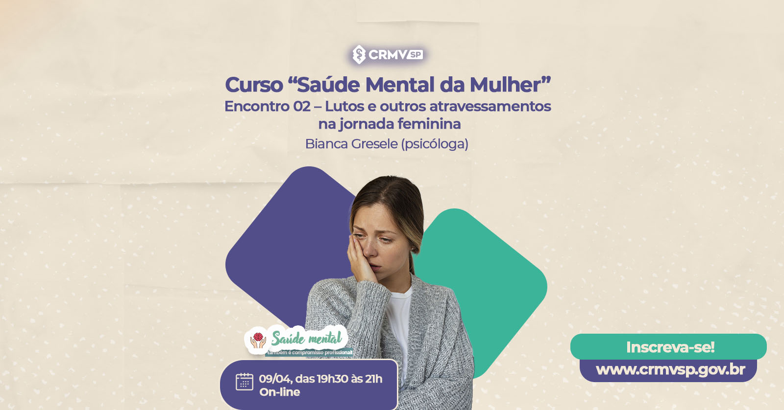 Voltado exclusivamente para mulheres médicas-veterinárias e zootecnistas, o Curso Saúde Mental da Mulher busca promover reflexões aprofundadas sobre os desafios enfrentados ao longo da trajetória profissional, abordando temas como saúde mental, autocuidado, desigualdade de gênero e desenvolvimento de carreira.