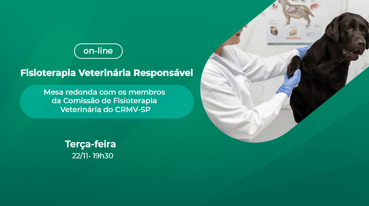 A Comissão de Fisioterapia Veterinária do CRMV-SP realizará mesa redonda sobre “Fisioterapia veterinária responsável”. O encontro será dia 22/11, às 19h30.