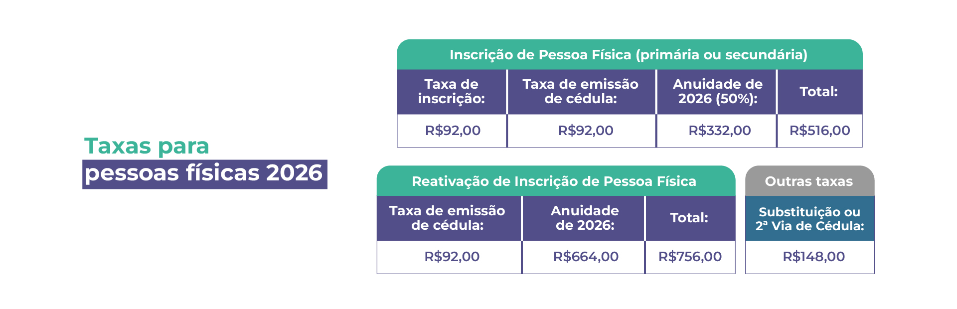 Os pedidos de inscrição, seja primária ou secundária, feitos em qualquer mês do ano terão uma taxa de R$ 516,00. Esse valor inclui as taxas de inscrição e emissão de cédula, além de 50% da anuidade de 2026. Para solicitações de reativação, será cobrada a taxa de emissão de cédula e a anuidade completa, independentemente do mês em que forem realizadas.