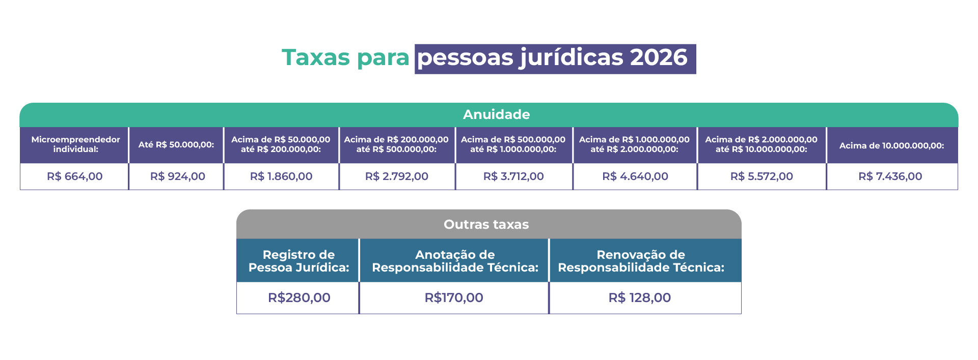 Desde 2023 não há mais cobrança de taxa de certificado. As taxas referentes ao registro de novas empresas, à nova inclusão e renovação anual de Anotação de Responsabilidade podem ser consultadas na tabela abaixo.